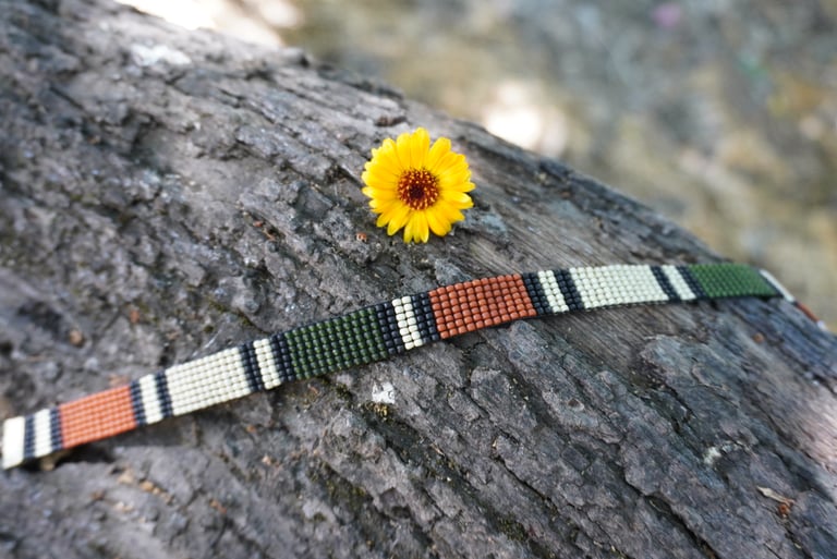 Hand beaded using Glass Japanese seed beads. Adjustable silver plated brass chain and clasp to fit any size.